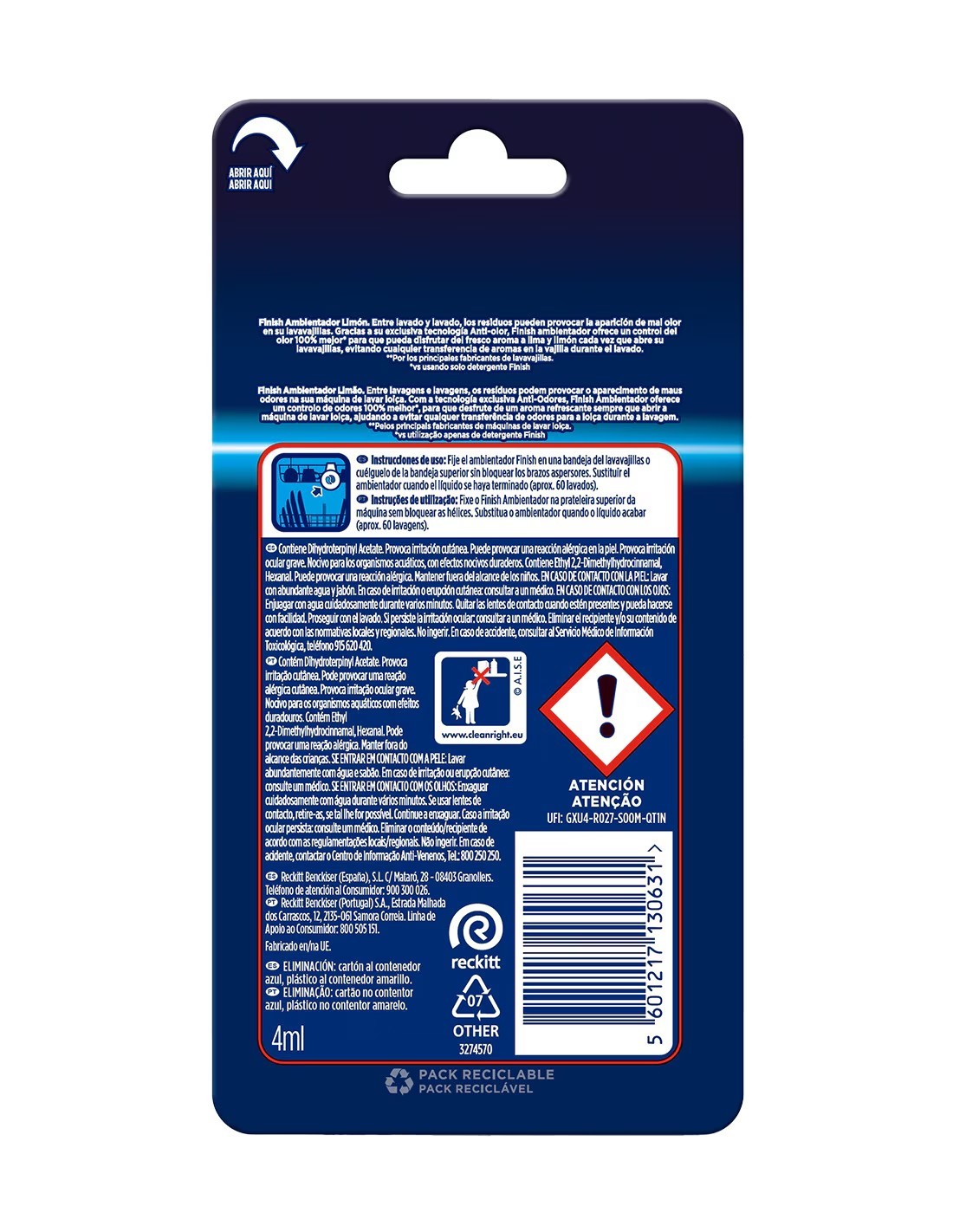 Ambientador Finish para lavavajillas aroma Limón y Lima. Neutraliza los malos olores y proporciona 60 lavados de frescor intenso.