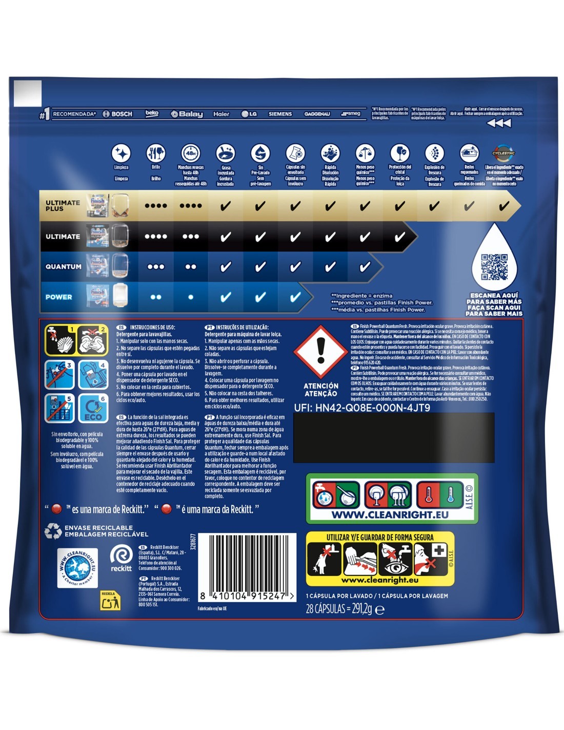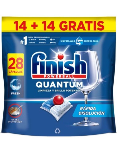 Finish Quantum Lavavajillas 28 Pastillas (14+14) ofrece una limpieza superior para tu vajilla, incluso en ciclos cortos y a baja temperatura. Cada cápsula combina múltiples acciones: elimina grasa incrustada, combate las manchas difíciles como el té o el café, y aporta un brillo deslumbrante sin necesidad de prelavado. Su tecnología de triple cámara actúa con rapidez y eficacia, cuidando tanto el acero como el cristal. Perfecto para quienes buscan rendimiento y comodidad en el lavado diario.
