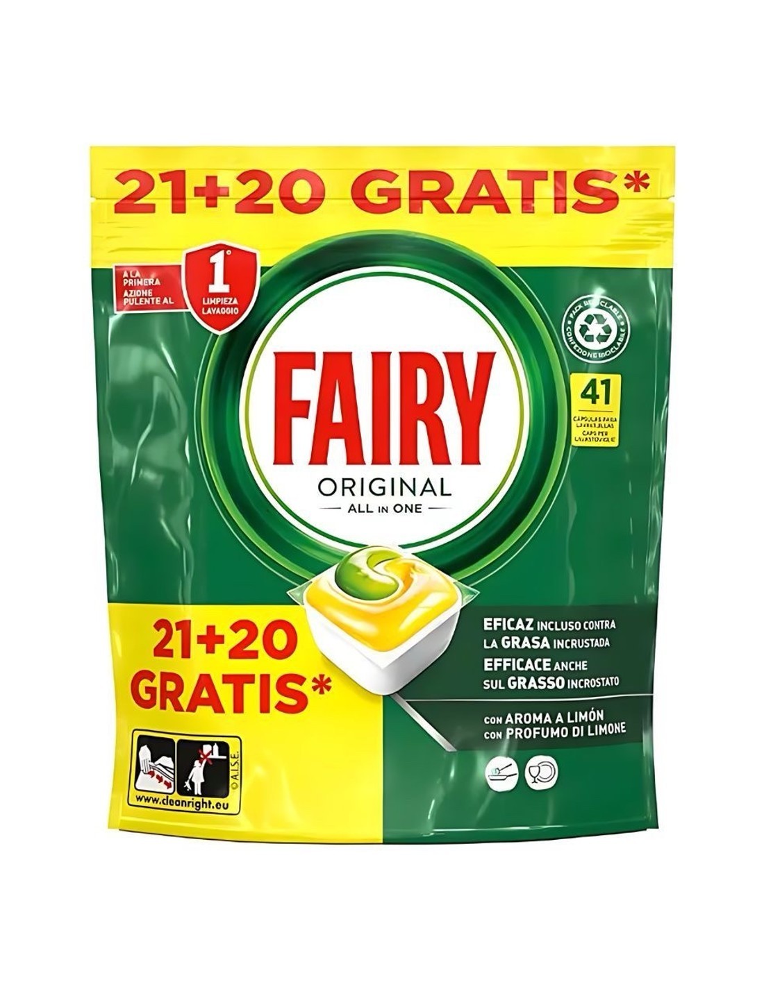 Fairy Cápsulas Lavavajillas Original Todo en 1 41 uds (21+20) es la solución completa para una limpieza profunda de la vajilla. Cada cápsula combina múltiples acciones en un solo producto: elimina grasa difícil, limpia en profundidad, abrillanta y protege tu lavavajillas.