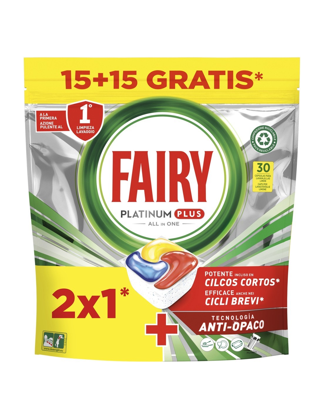 Fairy Cápsulas Lavavajillas Platinum Plus Todo en 1 30 uds (15+15) combina la eficacia limpiadora de Fairy con una fórmula avanzada que no solo elimina la grasa, sino que también actúa contra las manchas más difíciles, incluso las incrustadas. Estas cápsulas ayudan a restaurar el brillo original de los platos y proporcionan un acabado impecable sin necesidad de prelavado.