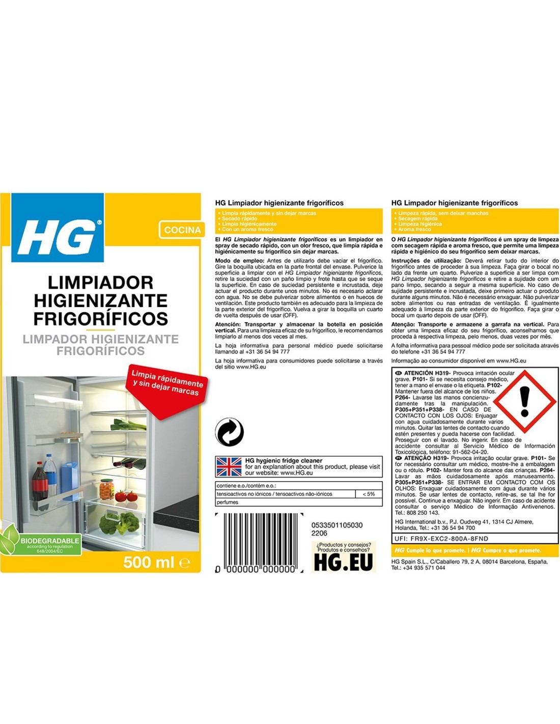 HG Limpiador Higienizante para Frigoríficos es un spray de secado rápido que permite una limpieza eficaz y segura de neveras, congeladores y vinotecas. Su fórmula fresca y biodegradable elimina restos de alimentos, manchas y malos olores sin dejar marcas visibles ni perfumes artificiales.