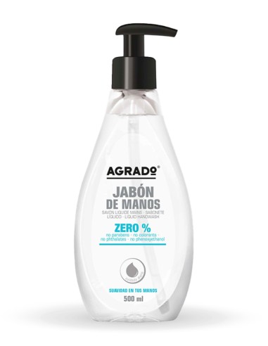 Jabón de manos AGRADO Dermo 0% sin colorantes ni parabenos. Limpieza diaria con total respeto por la piel. Formato dosificador de 500 ml.