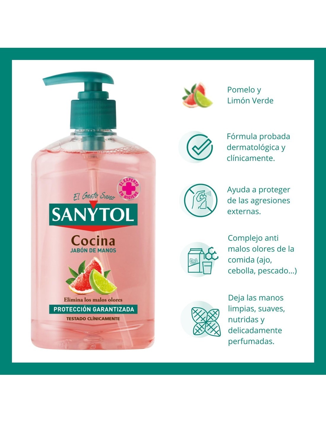 Sanytol Jabón Cocina 250 ml elimina eficazmente los olores persistentes de las manos. Limpieza higiénica con agentes antibacterianos y aroma cítrico.