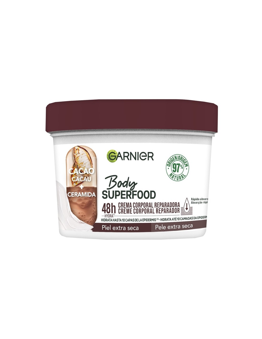 Nutre en profundidad y revive tu piel extra seca con la Garnier Body Superfood Gel Crema Corporal Cacao Piel Extra Seca 380 ML. Esta innovadora gel-crema, enriquecida con extracto de cacao, está diseñada para proporcionar hasta 48 horas de nutrición intensa, dejando la piel suave, flexible y confortada. Su textura ligera y de rápida absorción evita la sensación pegajosa, permitiendo vestir inmediatamente. Es el superalimento que tu piel necesita para recuperar su bienestar y elasticidad, con el delicioso aroma del cacao.