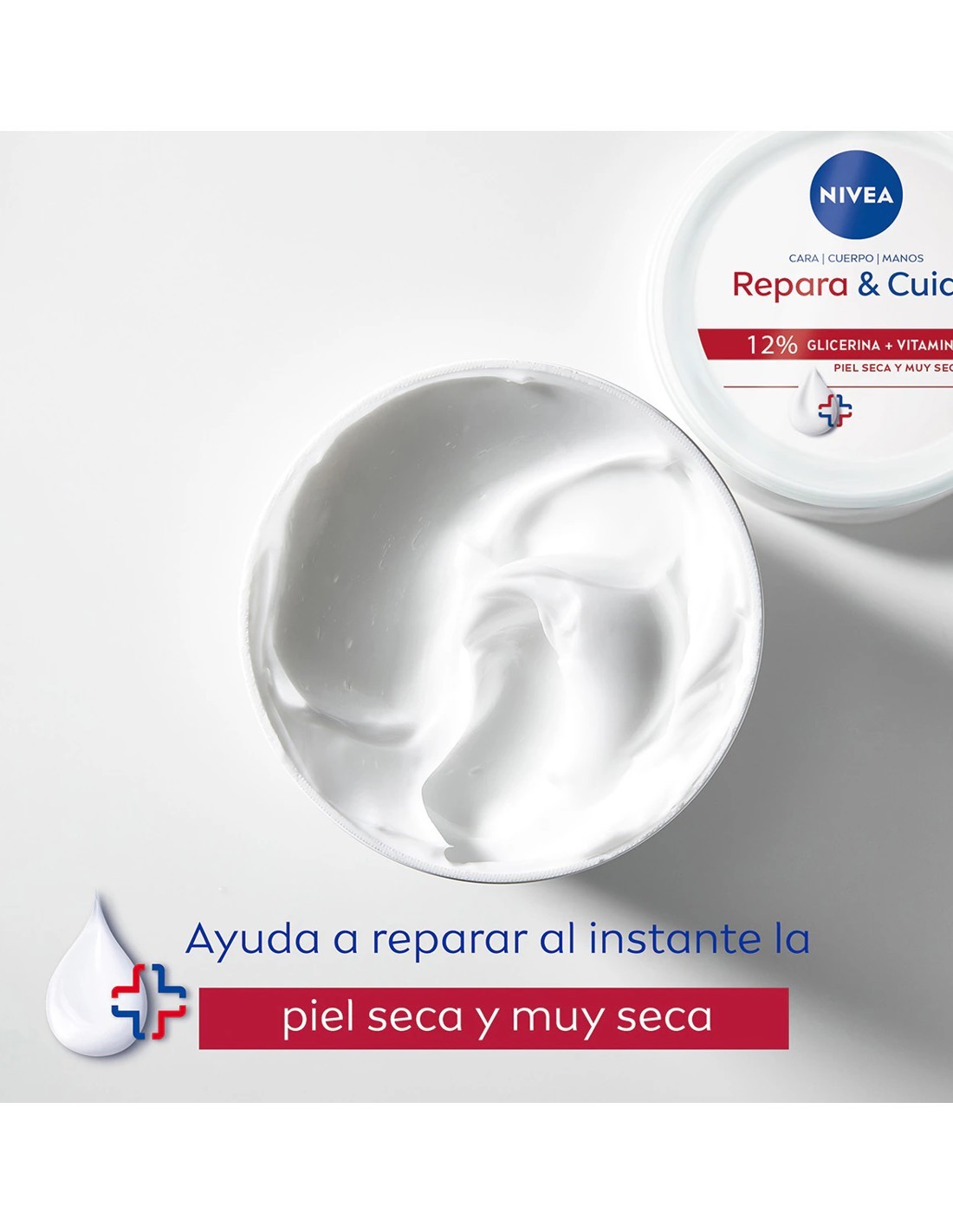 Nivea Repara & Cuida con glicerina y vitamina E está especialmente formulada para nutrir y restaurar la piel seca y extra seca. Su acción hidratante profunda alivia la sensación de tirantez y refuerza la barrera protectora de la piel, manteniéndola suave y flexible por más tiempo. Su textura de rápida absorción deja una sensación agradable sin efecto graso.