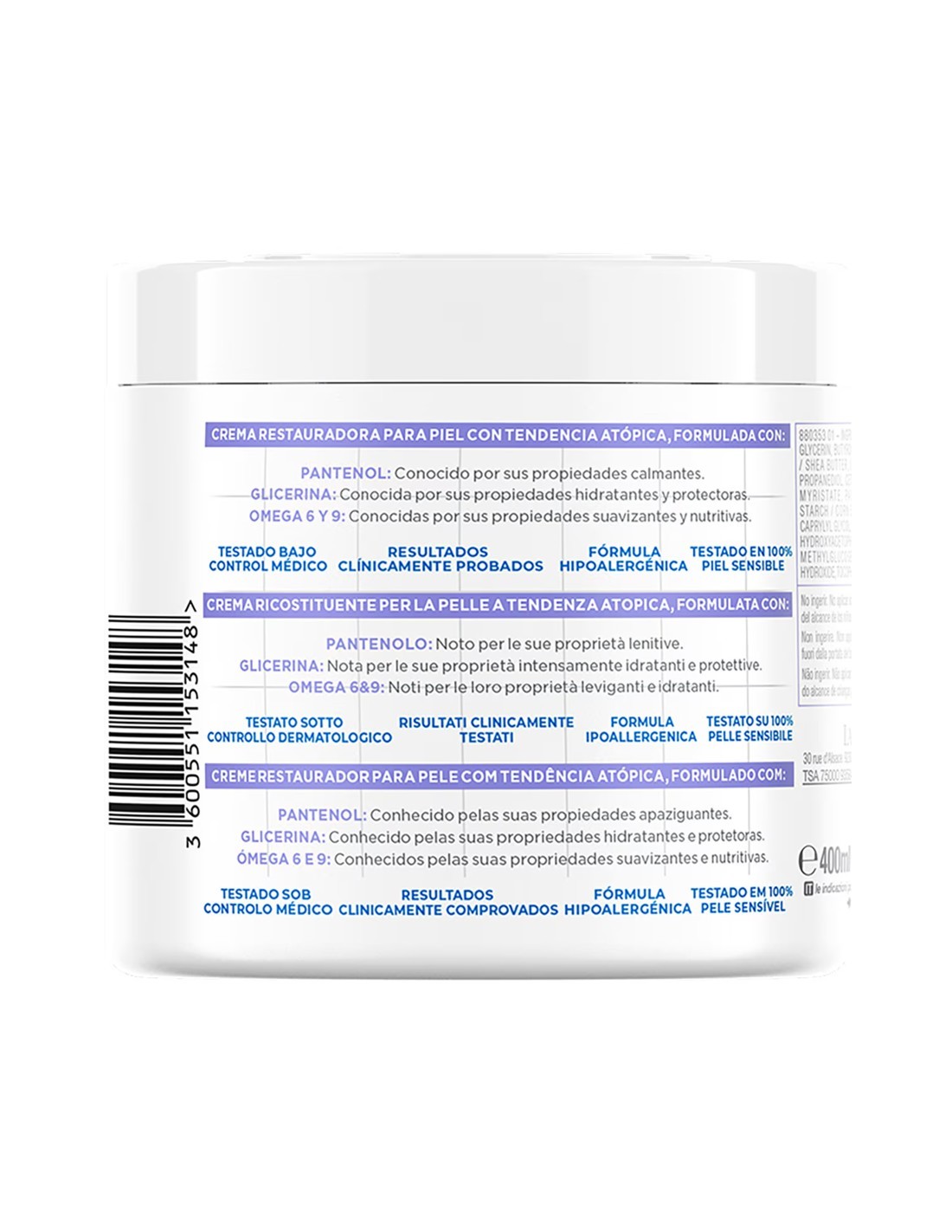 Su textura cremosa se absorbe fácilmente sin dejar sensación grasa, proporcionando confort inmediato y ayudando a reforzar la barrera natural de la piel. Es apta para el cuidado diario de toda la familia, incluso en pieles sensibles o con tendencia atópica.