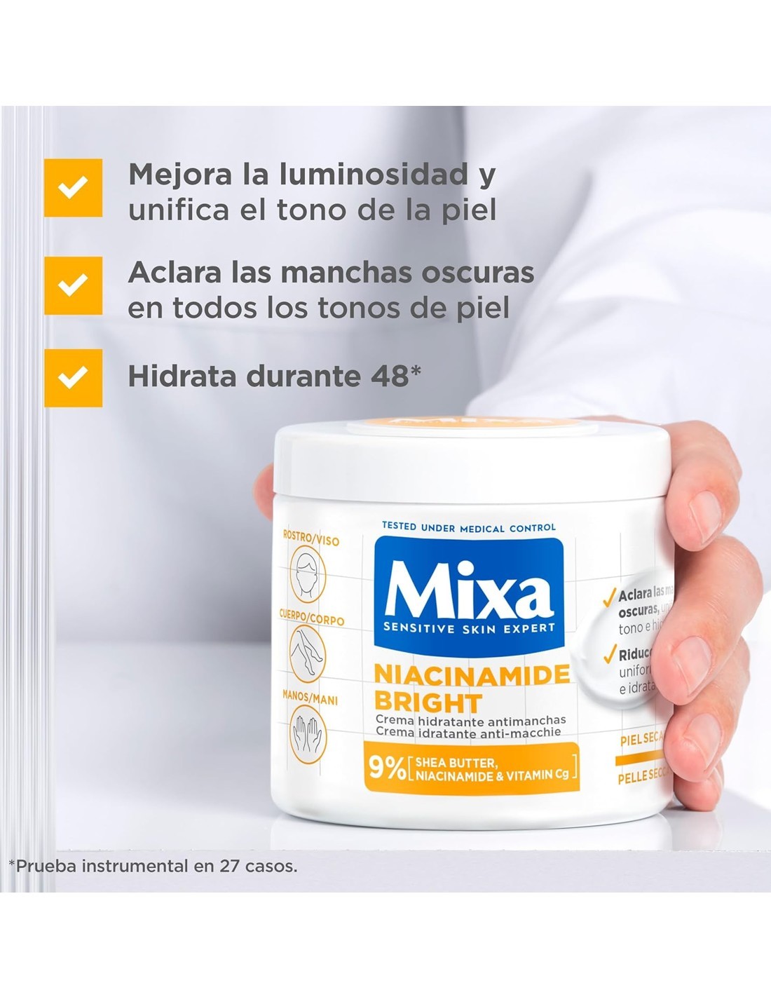 Mixa Crema Antimanchas 400 ml con niacinamida. Hidrata intensamente, unifica el tono y ayuda a reducir manchas. Apta para piel sensible.
