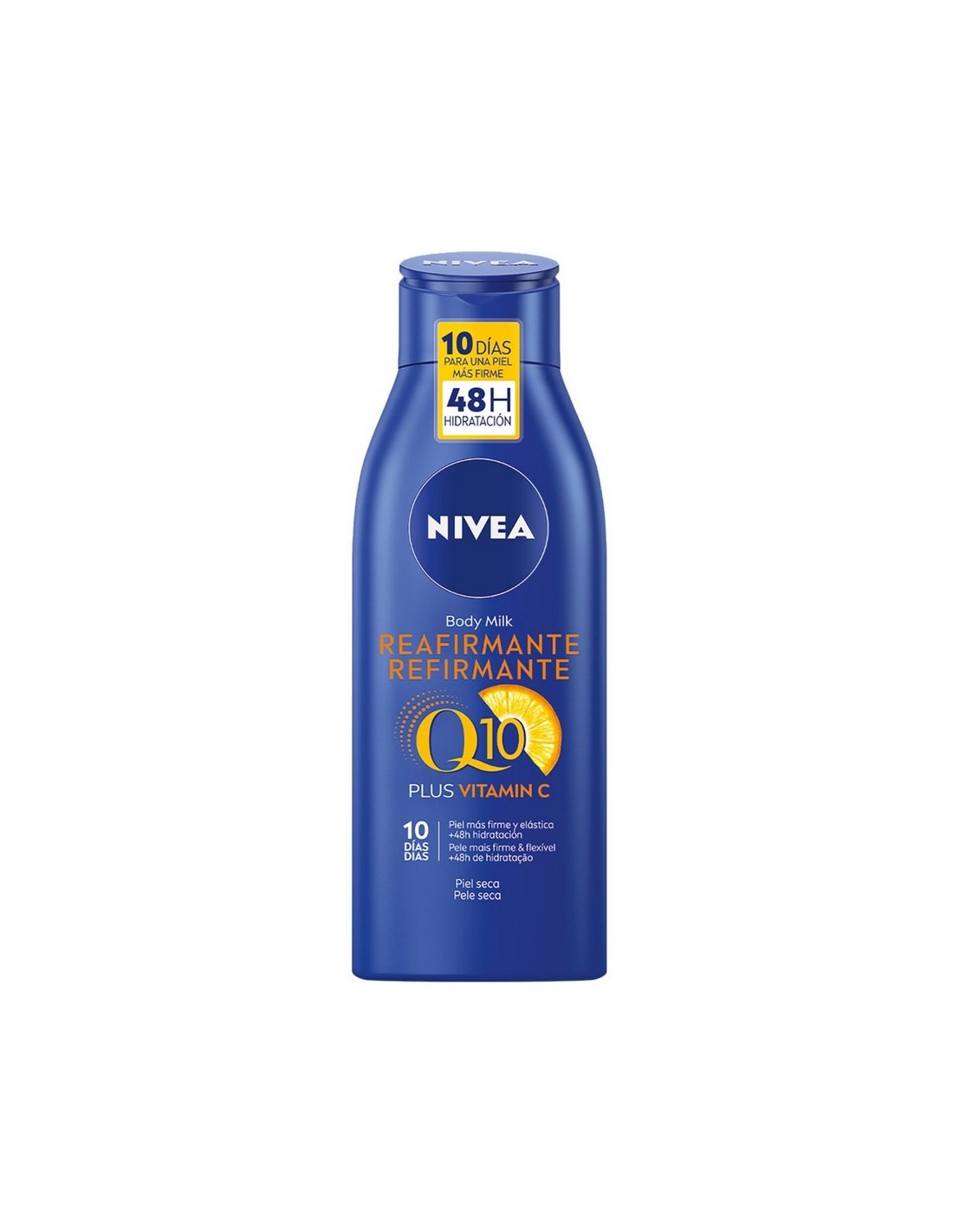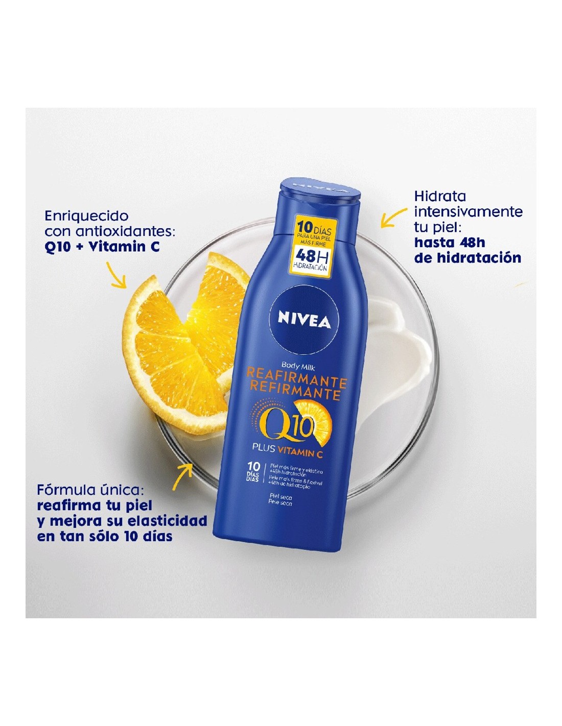 Nivea Body Milk Reafirmante Q10 400 ml, hidratación intensiva y firmeza para piel seca.