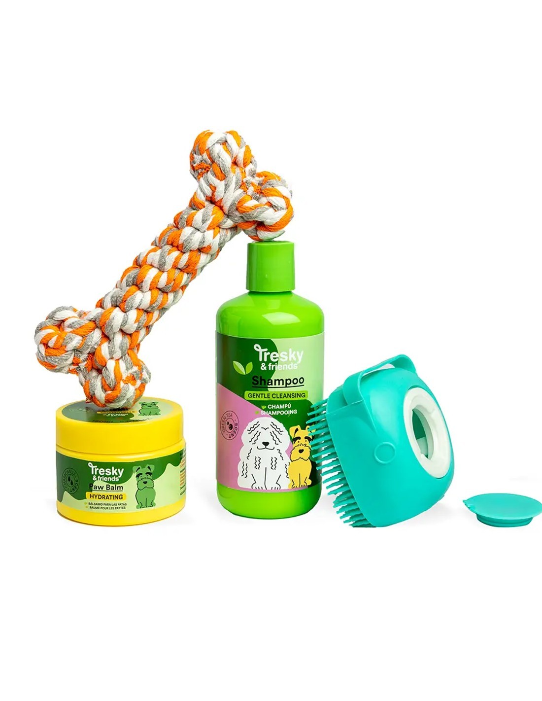 El Set de Cuidado y Bienestar de Tresky & Friends es el kit completo para transformar la rutina de baño de tu perro en una experiencia placentera y divertida. Este estuche de 4 piezas está diseñado para mimar a tu mascota y mantener su pelaje limpio y sedoso.