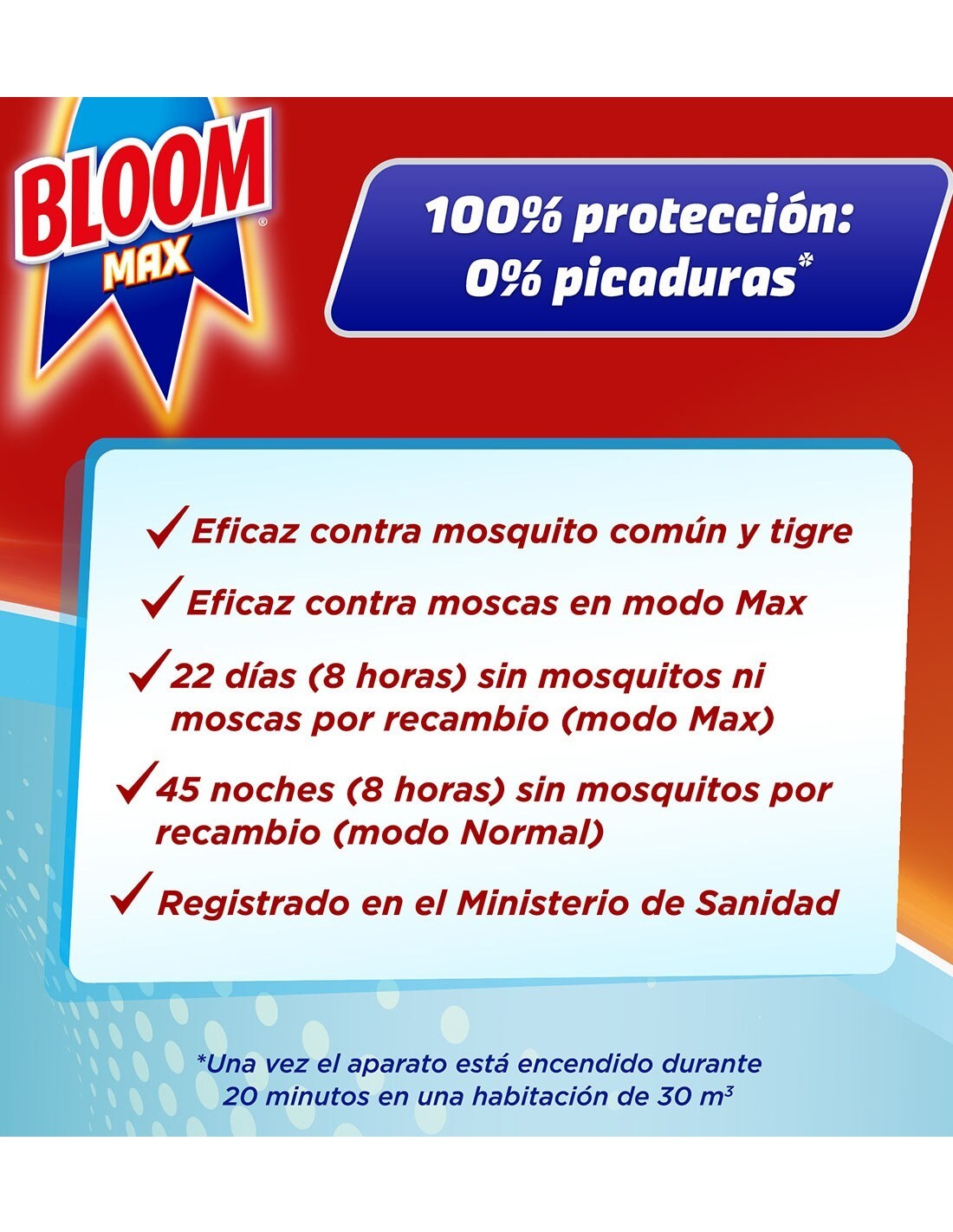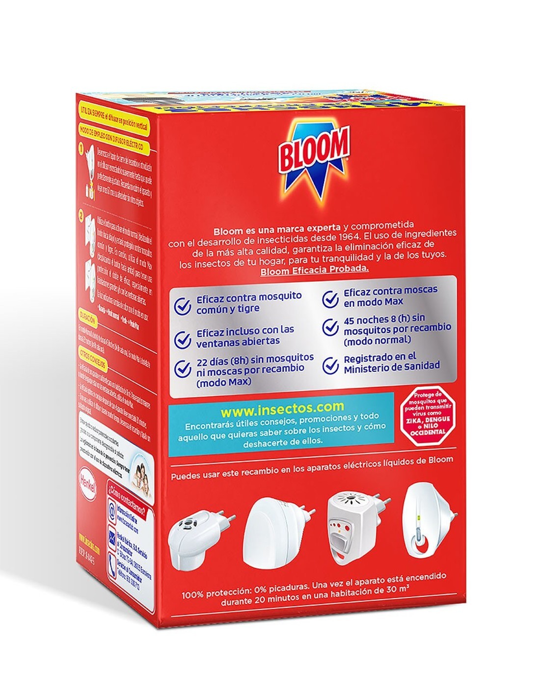 Bloom Eléctrico Recambio Líquido Max ofrece protección eficaz durante 45 noches contra moscas y mosquitos, incluyendo el mosquito tigre. Diseñado para usarse con los dispositivos eléctricos Bloom, garantiza una difusión constante y uniforme, creando un ambiente seguro y libre de insectos en el hogar. Su fórmula avanzada proporciona una acción prolongada sin necesidad de cambiar el recambio con frecuencia.