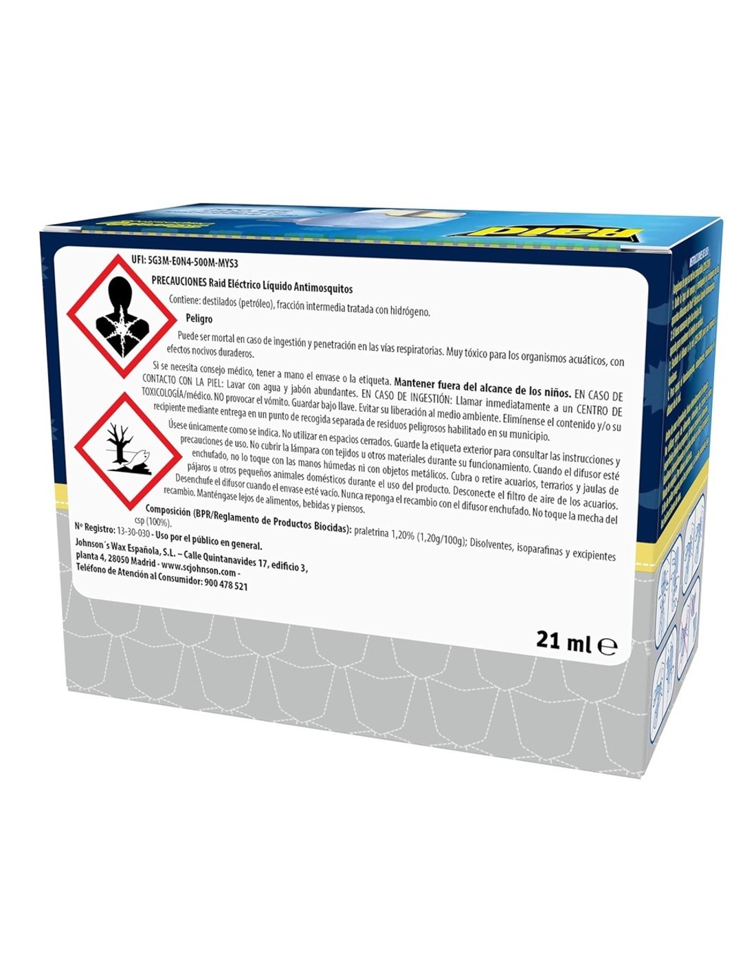 Raid Eléctrico Aparato + Family Luz ofrece protección continua durante 30 noches contra mosquitos comunes y tigre. Su sistema libera de manera uniforme el insecticida, asegurando un ambiente libre de insectos sin olores fuertes. Además, incorpora una luz nocturna suave, ideal para habitaciones infantiles o espacios de descanso. Compatible con recambios Raid Eléctrico.