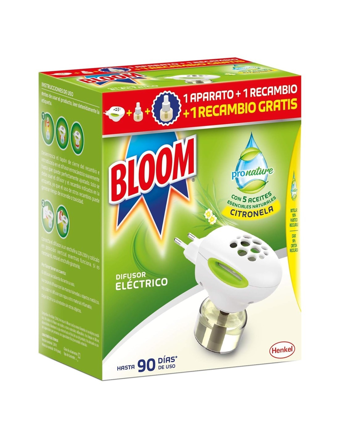 Protege tu hogar de los mosquitos con BLOOM ELÉCTRICO APARATO PRO NATURE + 2 RECAMBIOS 45 + 45 (90 NOCHES). Este sistema eléctrico proporciona una defensa eficaz contra el mosquito común y el mosquito tigre, garantizando un ambiente tranquilo y sin interrupciones durante 90 noches (cada recambio ofrece 45 noches de protección). Su fórmula, que incluye Praletrina y aceites esenciales como citronela, eucalipto, lavanda, limón y romero, actúa de manera potente sin dejar un fuerte olor a insecticida, ofreciendo una fragancia agradable.