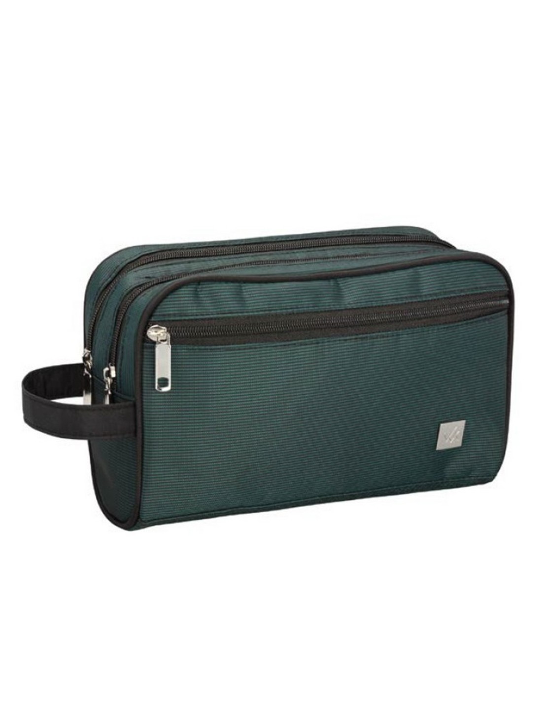 Neceser de viaje para hombre en color verde con varios compartimentos y asa lateral. Práctico, resistente y con cierre de cremalleras metálicas.