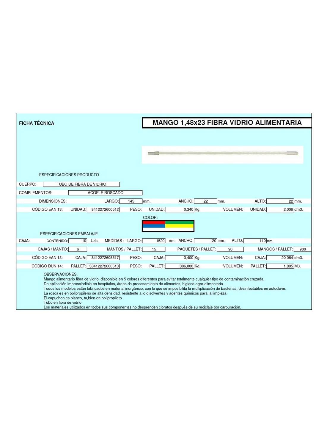 Mango profesional de 145 cm para uso alimentario. Fabricado en fibra de vidrio con acople roscado para herramientas de limpieza.