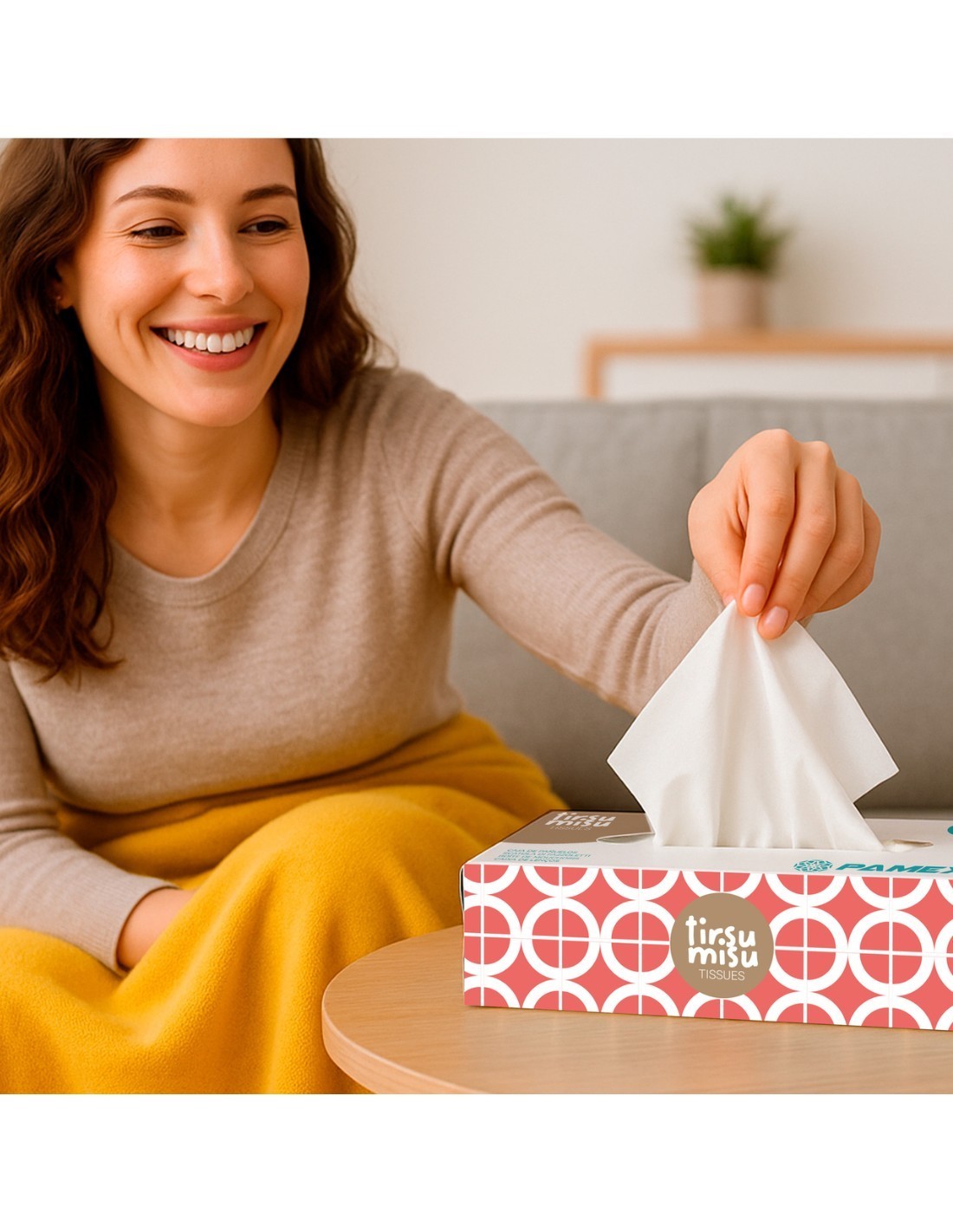 Caja de pañuelos faciales con 100 unidades, suaves y absorbentes. Cuatro diseños modernos para integrar estilo en el hogar, oficina o coche.