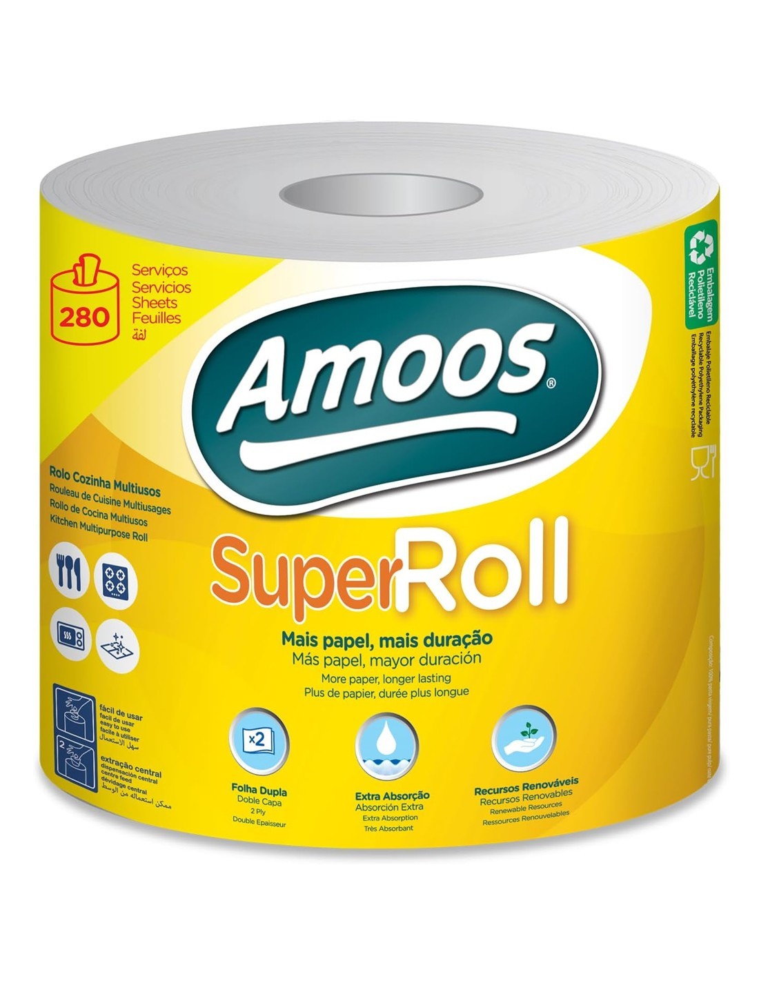 Amoos Rollo Multiusos Super Roll es ideal para la limpieza diaria en el hogar y otros espacios. Con 280 servicios y doble hoja, ofrece gran capacidad de absorción y resistencia, permitiendo un uso eficiente y duradero. Perfecto para limpiar superficies, absorber líquidos y mantener la higiene en cualquier momento.