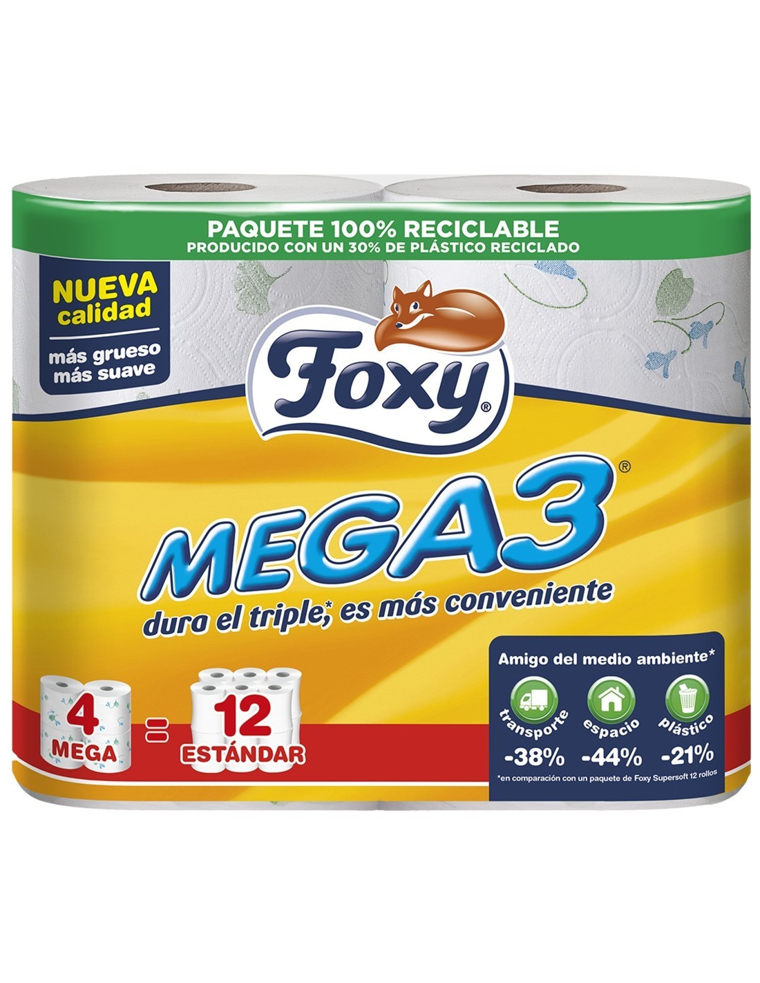 El Papel Higiénico Foxy Mega Triple Rollo Decorado combina suavidad, resistencia y diseño en un producto de máxima calidad. Este pack contiene 4 rollos extra grandes, ideales para un uso prolongado, reduciendo la necesidad de recambios frecuentes.