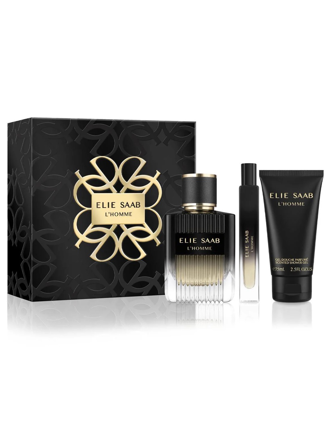 Set Elie Saab L'Homme Eau de Parfum para hombre. Incluye VAP 100 ml, gel de ducha 75 ml y VAP de viaje 10 ml. Fragancia amaderada especiada, fresca y elegante con notas de vetiver y mirra. Regalo perfecto.