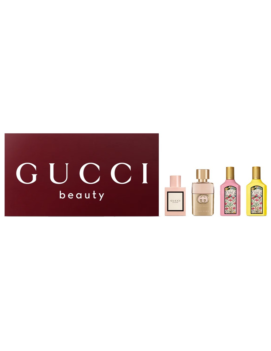 Prueba una selección de los aromas más emblemáticos de la casa Gucci con este exclusivo juego de miniaturas. Este set contiene cuatro versiones en tamaño reducido (5 ml cada una) de sus Eau de Parfum más conocidos, ofreciendo una oportunidad única para experimentar la versatilidad y el lujo de la perfumería Gucci.