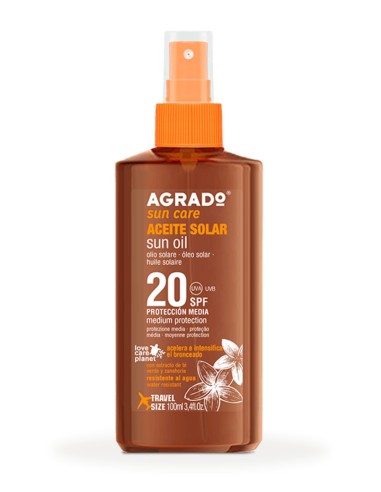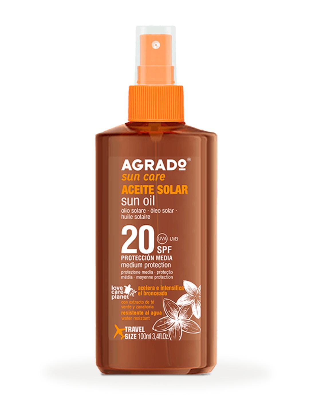 Aceite solar Agrado SPF20 en spray. Acelera el bronceado, textura ligera, resistente al agua y respetuoso con los océanos.