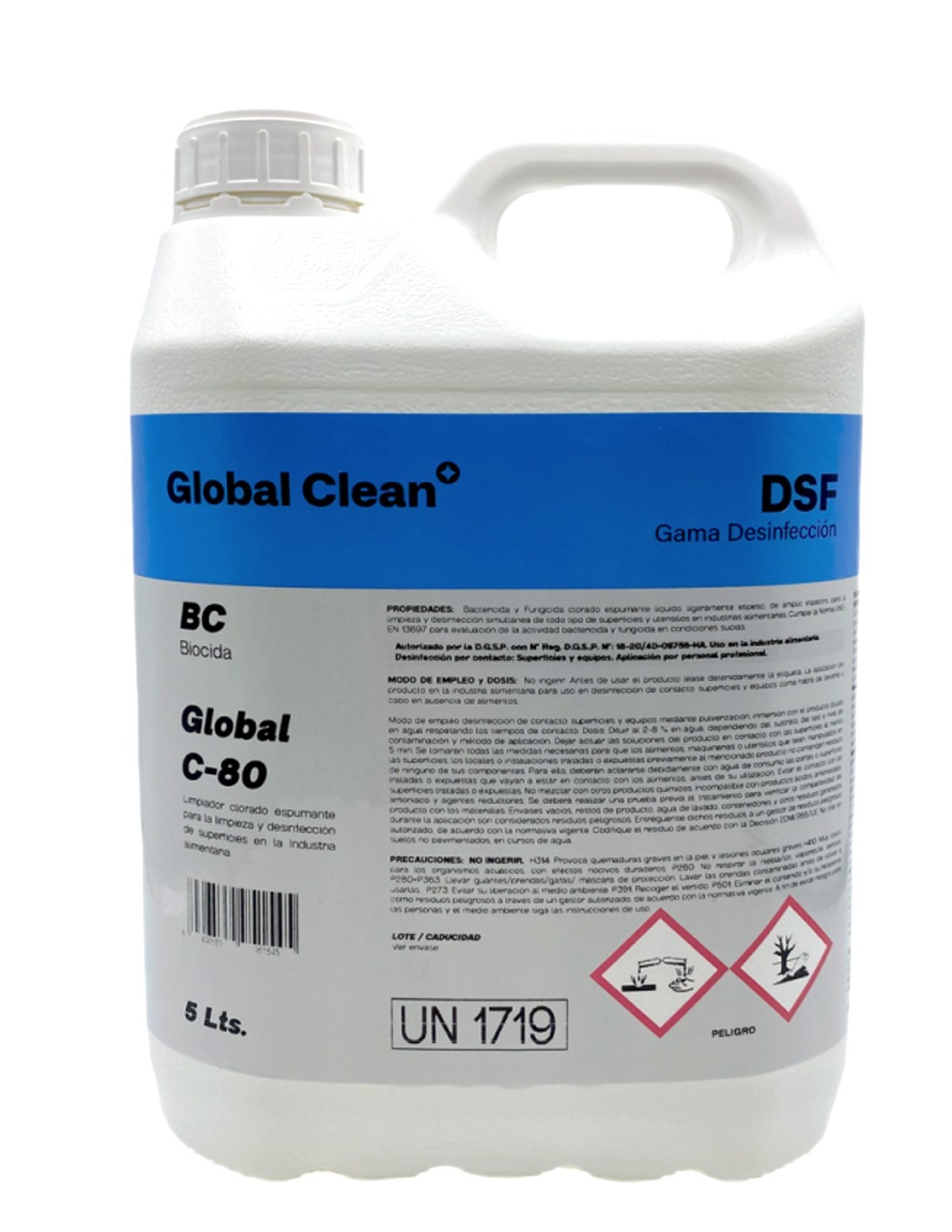 GLOBAL C-80 Desinfectante Clorado Profesional 5 Litros es un biocida líquido de uso profesional, formulado con hipoclorito sódico (cloro activo al 4,5%) para la desinfección de contacto sobre superficies y equipos, especialmente indicado para la industria alimentaria. Elimina eficazmente bacterias, hongos y microorganismos en superficies no porosas, incluso en condiciones sucias.