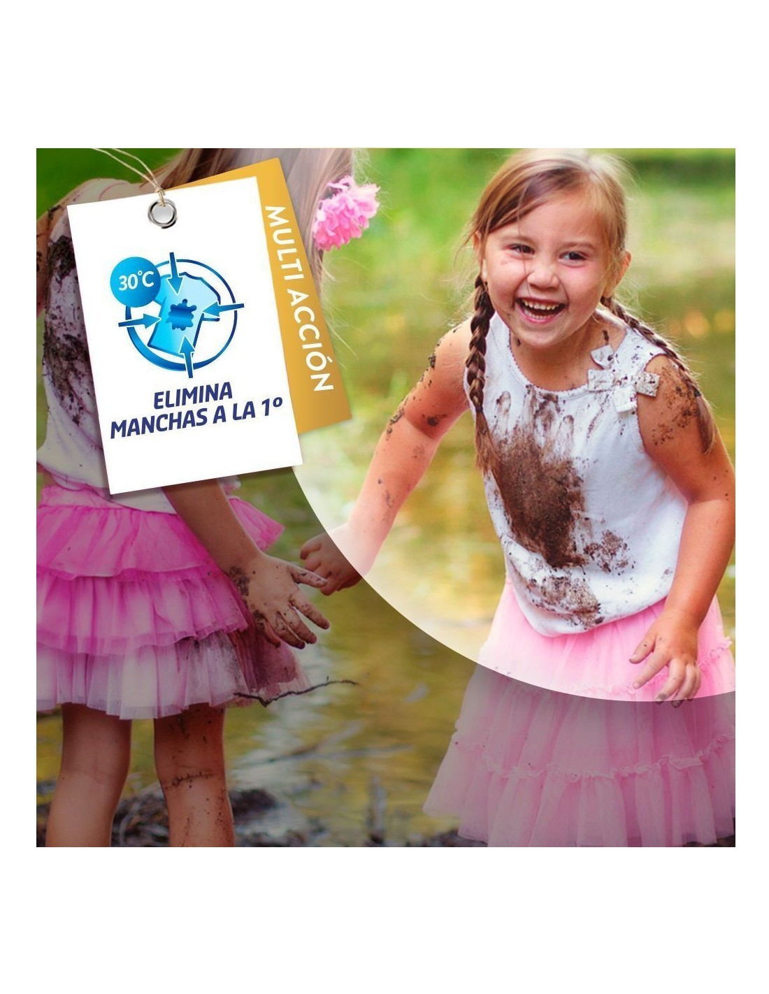 Pretratamiento: Mezclar ¼ de cucharada con agua, aplicar sobre la mancha y dejar actuar un máximo de 5 minutos. Frotar suavemente si es necesario.
