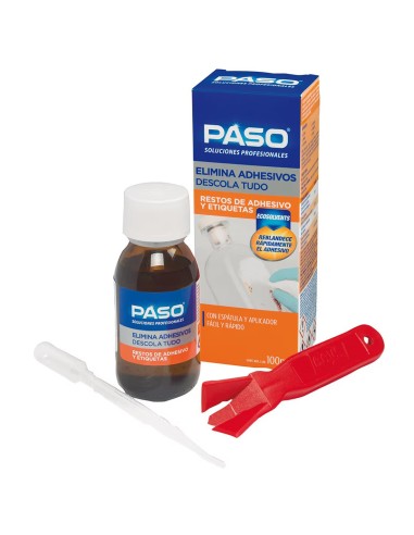 Paso Elimina Adhesivos y Etiquetas es la solución profesional para acabar con los molestos restos de pegamento, etiquetas, adhesivos y cintas autoadhesivas. Con una presentación de 100 ml, este producto cuenta con una fórmula a base de Ecosolvents que reblandece eficazmente el adhesivo para que puedas retirarlo de forma segura y sencilla, sin dañar la superficie.