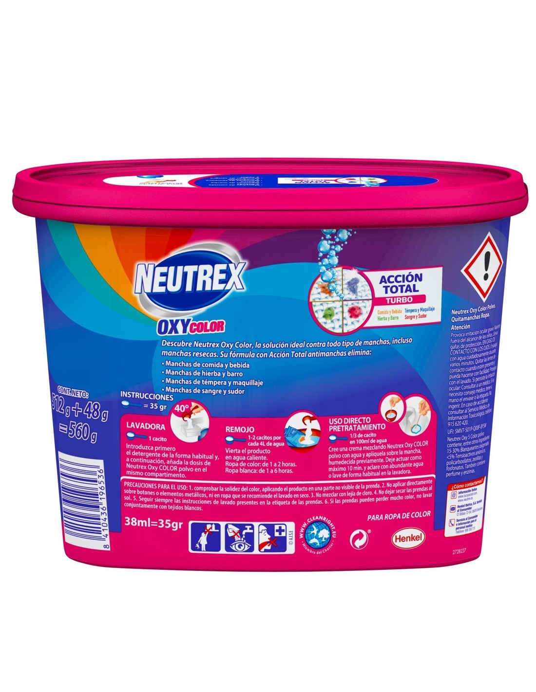Neutrex Oxígeno Color 16 Lavados 560 grs es un aditivo de lavado especialmente formulado para cuidar y proteger tu ropa de color. Este producto no solo actúa como un potente quitamanchas, eliminando incluso las manchas más difíciles, sino que también ayuda a preservar la intensidad de los colores de tus prendas, evitando que se deterioren lavado tras lavado.