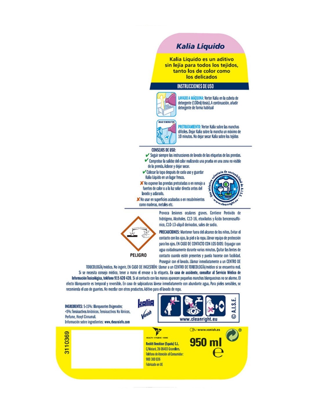 Kalia Quitamanchas Líquido 950ml. Sin lejía, para ropa blanca, de color y delicada.