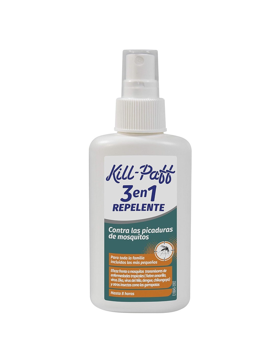 Kill Paff Repelente de Picaduras de Mosquitos 3en1 en spray proporciona una protección eficaz y duradera frente a las picaduras de mosquitos comunes y tropicales, incluidos los transmisores del dengue, zika o fiebre amarilla.