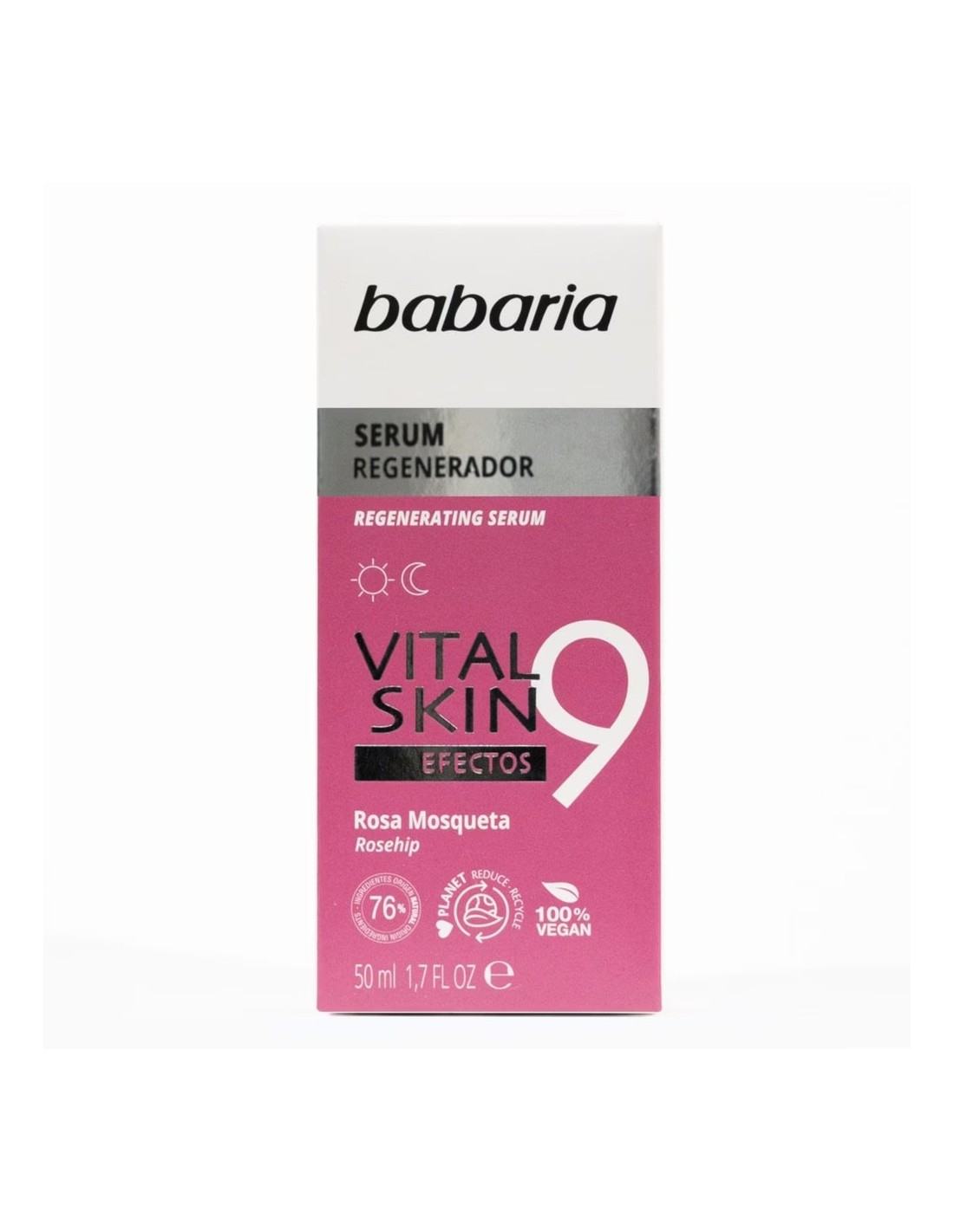 El Serum Vital Skin Rosa Mosqueta 9 efectos: antiarrugas, suaviza las líneas de expresión, atenúa los signos de fatiga, aporta hidratación, elasticidad, firmeza, suavidad y tono más uniforme. Además, gracias a su combinación con un activo derivado de la Soja, potencia la longevidad celular.