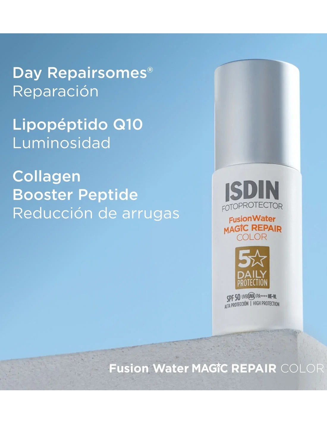 ISDIN Fusion Water Magic Repair Color SPF50 es un protector facial de textura acuosa y peso muy ligero que se absorbe rápidamente. Proporciona: