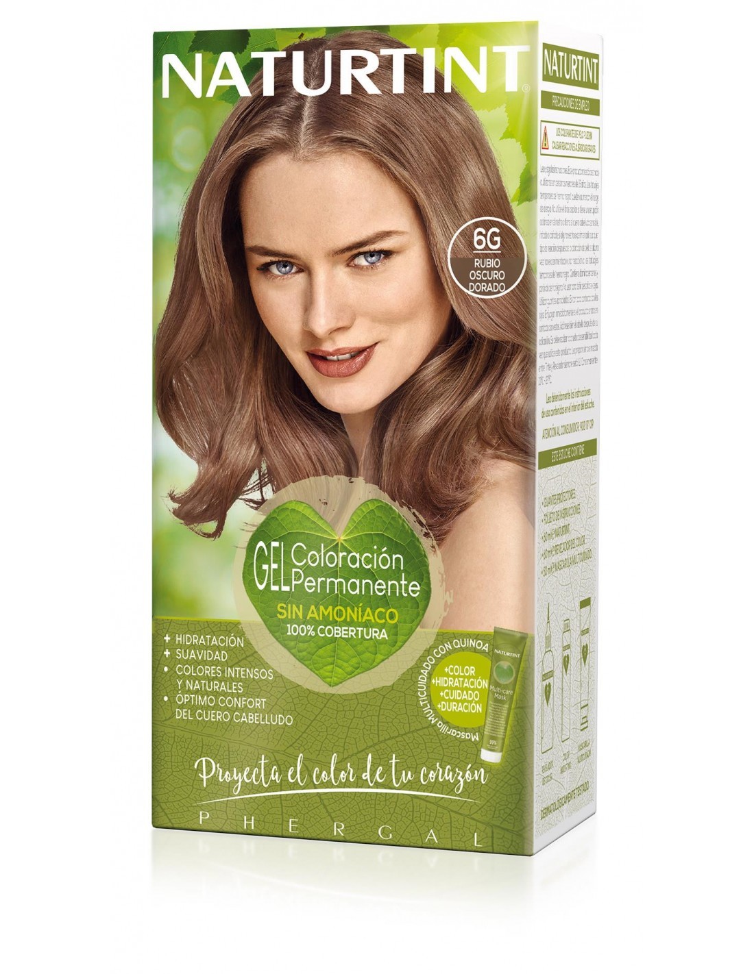 Coloración en gel 6G Rubio Oscuro Dorado de Naturtint. Permanente, sin amoníaco. Cobertura 100% de canas, con aceites botánicos y brillo dorado.