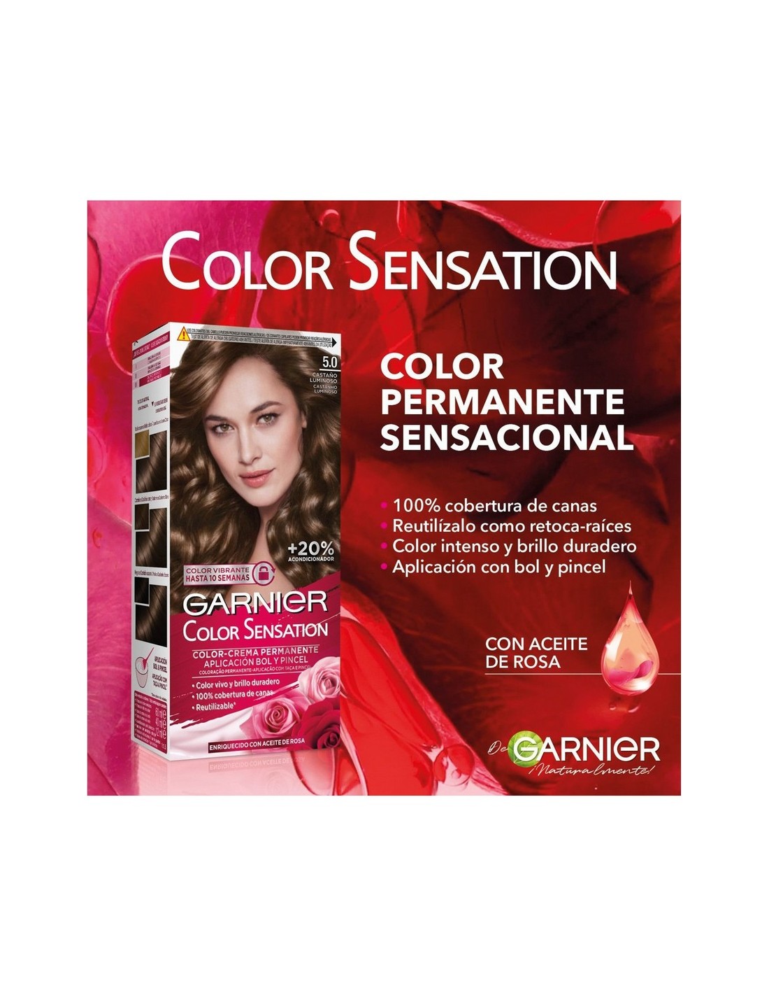 Tinte Garnier Color Sensation 5 Castaño Luminoso. Cobertura total de canas con color intenso, duradero y reflejos brillantes desde la primera aplicación.