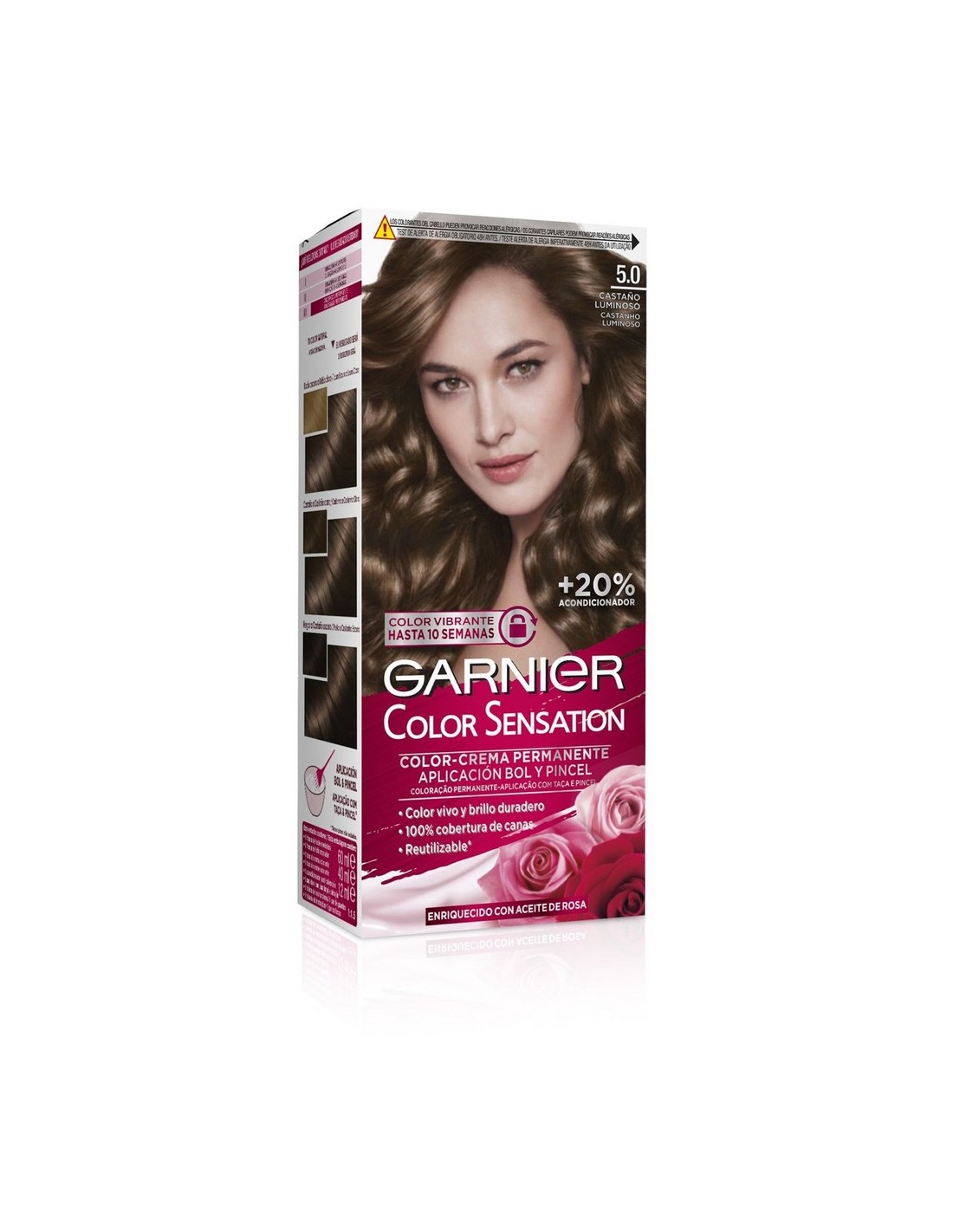 Tinte Garnier Color Sensation 5 Castaño Luminoso. Cobertura total de canas con color intenso, duradero y reflejos brillantes desde la primera aplicación.