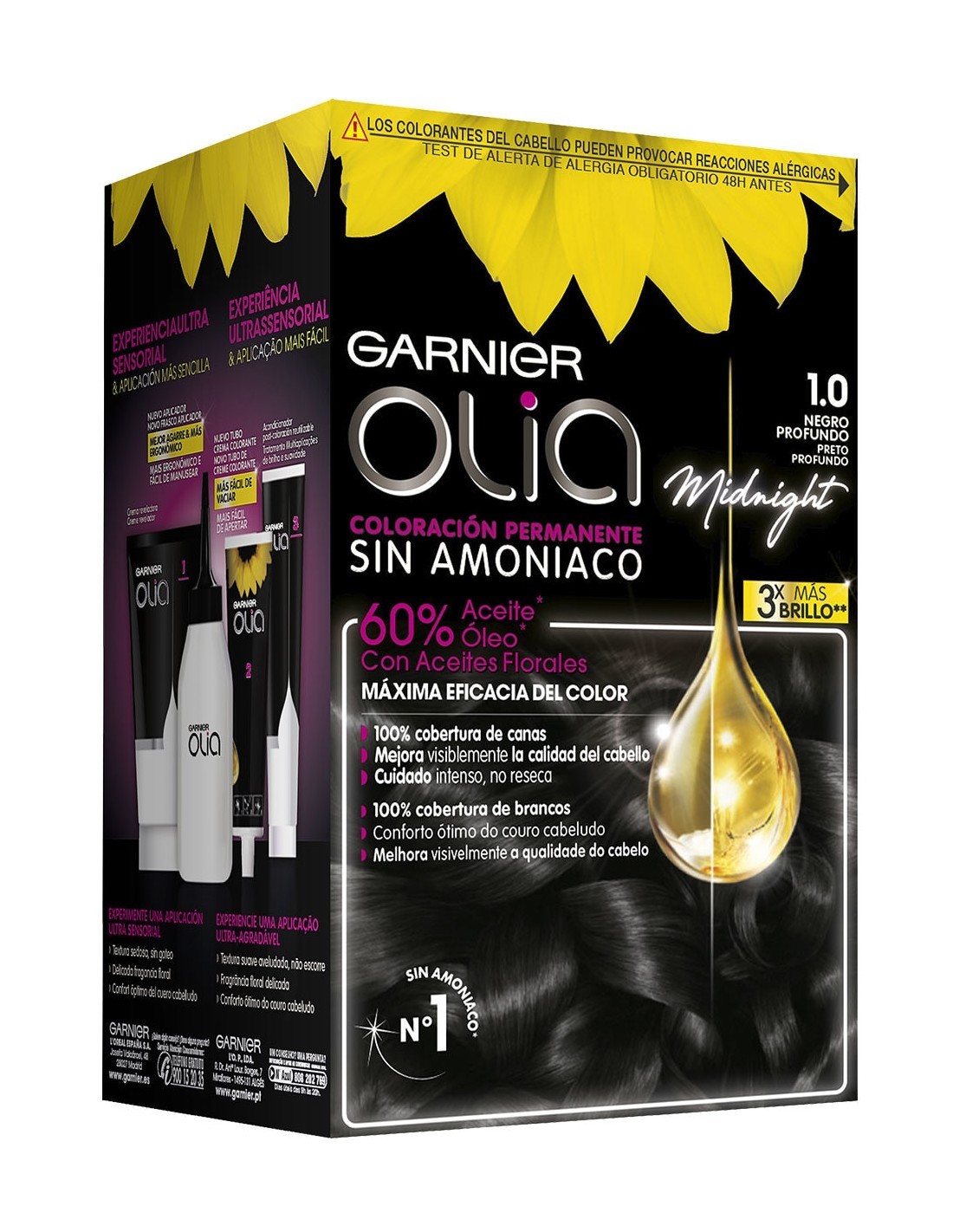 Olia Tinte 1.0 Negro Ébano sin amoníaco. Cobertura total de canas, color intenso y duradero, con aceites florales que nutren el cabello mientras tiñen.