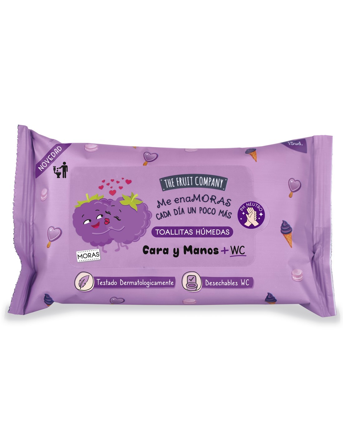Toallitas húmedas The Fruit de moras. Limpieza de manos, cara y WC. Formato de 15 unidades, testadas dermatológicamente.