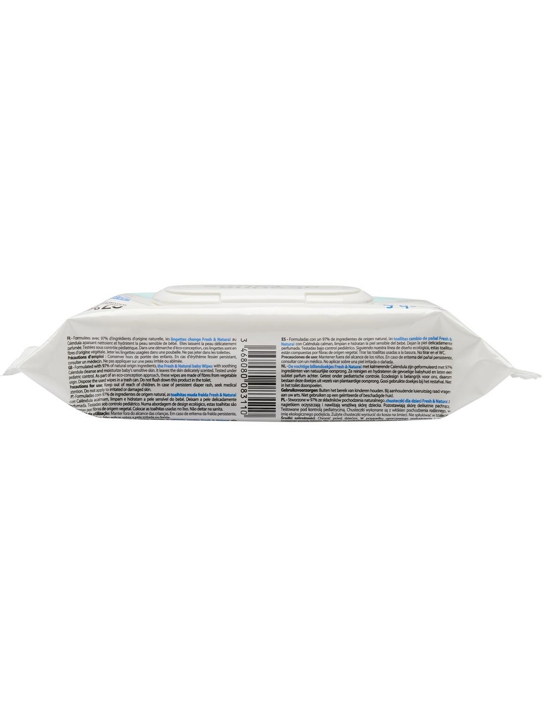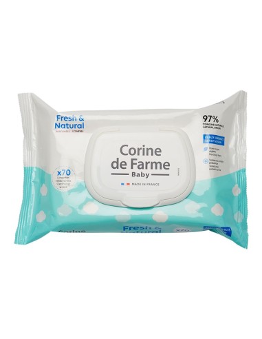 Toallitas húmedas Corine de Farme Fresh & Natural, con 97% de ingredientes naturales y caléndula para limpiar e hidratar la piel del bebé.