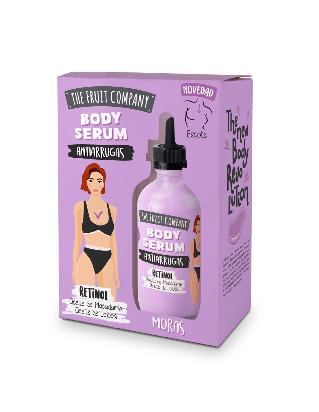 El Sérum Corporal Antiarrugas Moras de The Fruit Company está formulado específicamente para cuidar y suavizar la piel del escote y otras zonas delicadas. Su fórmula combina retinol, aceite de macadamia y aceite de jojoba para mejorar la elasticidad, reducir la apariencia de arrugas y nutrir intensamente la piel.